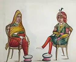 Jind Kaur Aulakh was born in Chachar, Gujranwala, the daughter of Manna Singh Aulakh, into an Aulakh Jat family the overseer of the royal kennels.[7] She had an elder brother, Jawahar Singh Aulakh and an elder sister, Bibiji Aas Kaur Ji, who married Sardar Jawala Singh Padhania, the Chief of Padhana in the Lahore District.[8] Manna Singh extolled Jind Kaur's beauty and virtues to Maharaja Ranjit Singh, who summoned and married her in 1835 by sending his 'arrow and sword' to the village.[9] On 6 September 1838 she gave birth to her only child, Duleep Singh.