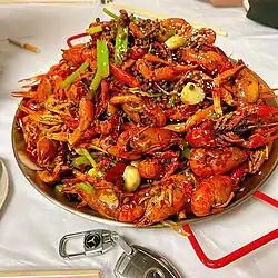 The specialties of Jinhu, such as silverfish from Gaoyou Lake, lobsters, the famed Jinhu large crabs, and clams from the Sanhe River, enjoy widespread popularity in markets both at home and abroad. The county's total area dedicated to aquaculture extends over 10,000 hectares, with inland waters covering 4,000 hectares and lake aquaculture systems occupying 6,000 hectares. The production of aquatic goods reaches 48,200 tons, with an average output of 134.2 kilograms per person, the highest in Jiangsu Province. The cultivation area for specialized aquaculture products, predominantly crabs, softshell turtles, and green shrimp,[13] spans 8,000 hectares, contributing to a yield of 13,500 tons. There is one professional fishing town and five fishing villages in the county, supporting over 2,600 fishing families and employing more than 8,000 individuals in the fishery sector.[10] The industry of crayfish(小龙虾) in Jinhu, from breeding and fishing to storage, transportation, and catering, has developed into a distinctive feature of Jinhu, renowned as Jinhu's speciality.[14]
