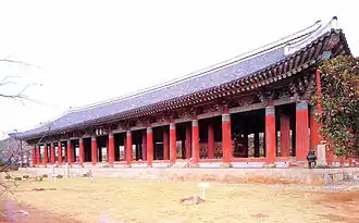 Jinnamgwan Hall (Korean: 진남관) is a historical building in the South Korean city Yeosu. The wooden structure consists of a roof, that is supported by 68 columns.[1] It is decorated with carved lotus buds, dragon heads, and Dancheong paintwork.[1][3] Jinnamgwan Hall is 75 m (246 ft) long and 14 m (46 ft) tall.[1]