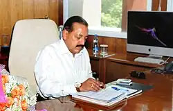 As a minister of science and technology, Singh launched India's first indigenously made research vessel named "Sindhu Sadhana" on 14 July 2014 from Mormugao harbour in Goa.[27] In a written response to the Lok Sabha on 31 July, he announced that India had signed cooperative arrangements with 33 countries for "peaceful use of outer space". He further added that areas of co-operation included remote sensing of earth, launch services, satellite communication, telemetry, space exploration and space law.[28] He further launched India's first home-made broad spectrum confocal microscope on 7 October at New Delhi.[29] He announced that the government was considering increasing the retirement age of scientists to 62 years.[30] The ministry increased the stipend of researchers by 50% at the end of the month.[31] On 8 November 2014, Singh was replaced by Harsh Vardhan, another doctor as the minister of science and technology and earth sciences.[32]