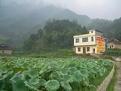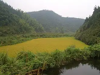 ![]() View of the Jiugong Range and a rice field | |