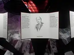 A drawing of Vale e Azevedo alongside a description of his presidency of Benfica on display at Museu Benfica