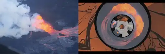Twelve years after first witnessing and filming a total solar eclipse Gillerman began a new phase in her work, recording and reworking macrocosmic primal events around the world.[21][27] In July 1991 she traveled with collaborator Rob Terry to the Island of Hawaii to record a spectacular confluence of natural events: a total solar eclipse coinciding with the eruption of an active volcano, Kilauea.[2][21] She reconstituted the resulting material—views of the eclipse, horizon and surroundings (captured by a custom-designed 360-degree panning device)—into interactive installations with sculptural elements, CD-ROMs and a video, Volcanic Eclipse (1993), noted for its striking sense of light, images of neon-glowing molten lava, and unique framings of land and sky.[2][27] The interactive environment, The Sun Drops its Torch (1995), was intended as a "sacred space" in which to explore the phenomena on personal, cultural and universal levels.[17][28] It consisted of a semi- or full circular ring of 10–24 monitors and audio speakers, placed within a multi-user system of floor sensors that enabled viewers to reconfigure images, multilingual, indigenous stories and sounds, and fragments of the event without using a mouse or keyboard.[11][27][2]