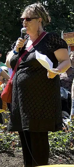 Josephine Grace Brand (born 23 July 1957)[1] is an English actress, comedian, presenter and writer.[2] Starting her entertainment career with a move from psychiatric nursing to the alternative comedy stand-up scene and early performances on Saturday Live, she went on to appear on The Brain Drain, Channel 4's Jo Brand Through the Cakehole, Getting On and various television appearances including as a regular guest on QI, Have I Got News for You and Would I Lie to You?. She also makes regular appearances on BBC Radio 4 in programmes such as The News Quiz and Just a Minute. Since 2014 she has been the presenter of The Great British Bake Off: An Extra Slice. In 2003, Brand was listed in The Observer as one of the 50 funniest acts in British comedy.