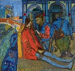 Early in her trip, Eardley had destroyed all but one of the paintings she had made by that stage, but back in Venice she painted, and retained, a number of works. During her stay in Venice in 1949 Eardley worked mainly in charcoal and pastel. Beggars in Venice is an example of the few oil paintings she produced at the time. The intense blue reflects the love for Giotto she developed during her time to Italy. The location shown is the Campo SS Giovanni e Paolo, a large square in Venice. The building depicted is the Scuola Grande di San Marco, built in the fifteenth century as a great philanthropic confraternity. Walter Sickert painted exactly the same view in his The Scuola Grande di San Marco.[23] Eardley portrays the beggars gathered there with the same tenderness and sympathy she was later to bring to bear portraying the lives of the disenfranchised in the tenements of Glasgow.[24][21] The painting realized £169,250 at a Sotheby's London sale on 26 August 2008.[25] On her return to Scotland in 1949 she mounted an exhibition, effectively her first solo exhibition, of work done in Italy, including a number of striking scenes of peasants, beggars, children and old women.[21][17]: 117 The exhibition, at the Mackintosh Gallery of the Glasgow School of Art, met with considerable praise and several of the works shown were acquired by the Aberdeen Art Gallery and for the Glasgow School of Art's own collection. [9]