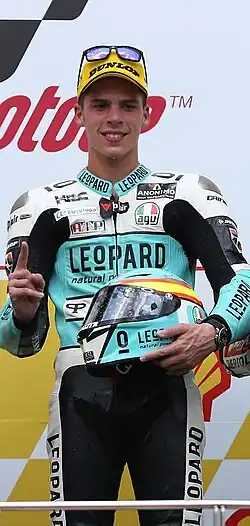 A further podium finish in Teruel and poor results from Quartararo, Viñales and Andrea Dovizioso saw Mir extend his championship advantage to 14 points over second-place Quartararo with three races remaining.[10] At the European Grand Prix, staged at the Circuit Ricardo Tormo near Valencia, Mir took his maiden win, beating his teammate Álex Rins, who finished in second place. With Quartararo falling early in the race and only able to salvage 2 points, Mir took a commanding 37-point lead over both his rivals with only 2 rounds remaining.[11][12] The following week at the Valencian Community Grand Prix at the same circuit, Mir finished in 7th place, while Rins managed only 4th and Quartararo crashed out, crowning Mir the 2020 MotoGP riders' champion, as Team Suzuki Ecstar were also crowned teams' champions for the first and only time in their history.[13] Mir was also Suzuki's first premier class riders' world champion since Kenny Roberts Jr. in 2000, and the first during the MotoGP era.