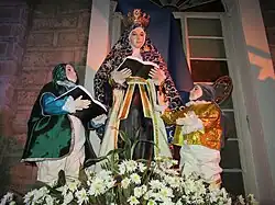 In the earliest biography of Dominic, by Jordan of Saxony, Dominic's parents are not named, but the story is told that before his birth his mother dreamed that a dog leapt from her womb carrying a torch in its mouth and set the world aflame.[1] Jordan adds that Dominic was brought up by his parents and a maternal uncle who was an archbishop.[2] A later source, still of the 13th century, gives the names of Dominic's mother and father as Juana and Felix.[3] Nearly a century after Dominic's birth, a local author asserts that Dominic's father was vir venerabilis et dives in populo suo ("an honoured and wealthy man in his village");[4] later hagiographers, elaborating on this, gradually developed identities for his father, said to be a member of the local noble family Guzmán and for his mother, who was eventually attached to the neighbouring noble Aza family.
