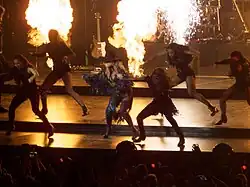 Jon Caramanica from The New York Times felt that the first part of the show was "disjointed, shifting styles and attitudes seemingly at random", but Gaga later "struck a rhythm". He further complimented the piano sessions, writing that "Gaga was at home" with the instrument.[50] Selena Fragassi from the Chicago Sun-Times complimented the set design, the costumes, and Gaga's "nearly pitch-perfect" vocals, saying that the show is "just another testament to Gaga's star power". However, she was critical of Gaga's dancing abilities, saying that "the singer, though, was a shadow of her former dancing self, relying on years-old choreography and struggling to keep her balance on 'Bad Romance'."[51] Similarly, Mikael Wood from the Los Angeles Times believed that the ballads were the concert's highlight, adding that "she's begun to tire of carefully synchronizing all those moving parts. In busy old hits like 'LoveGame' and 'Telephone', Lady Gaga put across little visible excitement".[52] Richard Burnett wrote a positive review for the Montreal Gazette, saying that "what Gaga lacked in overall musical momentum was more than made up for by her eye-popping multiplatform main stage" with its special effects.[36] Writing for The Detroit News, Adam Graham called Gaga "dynamite throughout the night" and praised her connection with the audience, while criticizing the overlong costume changes "as her band was forced to fill in the gaps with extended vamping".[53]