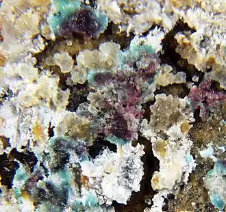 ![]() Joanneumite (violet crystals), surrounded by salammoniac (fine-grained, blue-green mineral) | |