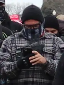 Outside the Capitol Building, Biggs spoke privately with Ryan Samsel, who immediately thereafter was the first person to breach the security perimeter.[10] Biggs was one of the first to breach the building itself at about 2:13 p.m., 20 seconds behind Dominic Pezzola, who smashed a Senate window with a riot shield;[18] he was identified by the FBI via photos and videos taken there.[17] Biggs and other Proud Boys were wearing walkie-talkies to allow real-time communication,[18] and Biggs was recorded on video saying of the breach, "This is awesome!"[17] He later left the building, but returned 30 minutes later alongside some Oath Keepers, pushing their way past a law enforcement officer.[21]