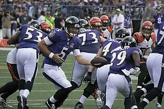 Due to a season-ending injury to incumbent starter Kyle Boller and an illness to former Heisman Trophy winner Troy Smith, Flacco became the starting quarterback in the 2008 season opener against the Cincinnati Bengals. He completed 15 of 29 passes for 129 yards, his longest pass being a 15-yard play to Derrick Mason. He threw no touchdowns and no interceptions in his debut, but he had a 38-yard rushing touchdown,[28] which was the longest rushing touchdown by a quarterback in Ravens' franchise history at the time (the record has since been broken several times by Lamar Jackson). Flacco's touchdown put the Ravens up by 17–3; the team eventually won the game 17–10.[29]