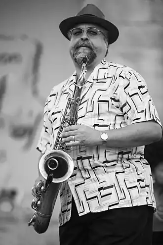Joseph Salvatore Lovano (born December 29, 1952)[1] is an American jazz multi-instrumentalist. Though best known as a tenor saxophonist, Lovano has also recorded on alto clarinet, flute[1] and drums, amongst other instruments.[2] He has earned a Grammy Award and several mentions in Down Beat magazine's critics' & readers' polls. His wife is singer Judi Silvano, with whom he records and performs. Lovano was a longtime member of the late drummer Paul Motian‘s trio alongside guitarist Bill Frisell.[3]