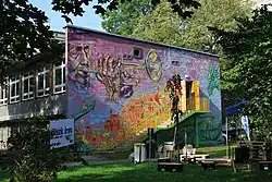 Joel Bergner (aka Joel Artista) is an American muralist, street artist, and educator who creates large-scale works of art with the participation of young people and communities around the world.[1][2][3][4][5][6] Bergner is the co-founder and co-director of the non-profit organization Artolution, which organizes community-based public art initiatives with those who have experienced armed conflict, trauma and social marginalization.[7][8][9] He has led such projects with incarcerated teenagers, Syrian refugees, youth from slum areas, the mentally and physically disabled, young people with substance abuse issues, orphans and street children.[10][5][11][12][4][13]
