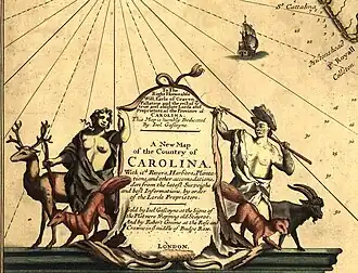 In 1678 Gascoyne drew on vellum for Captain John Smith a coloured portolan chart[5] pasted on four hinged oak boards; the western half survives at the National Maritime Museum Greenwich. Coming to the attention of the Lords Proprietors of the province of Carolina, he was commissioned to engrave a map of their province (1682) from the latest surveys;[5] their intention was to attract immigrants to the new colony.[6]