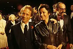 Grey reprised his role as the Master of ceremonies in the 1972 Bob Fosse directed film version of Cabaret. Fosse, who was hired to direct the film version because Harold Prince was unavailable, wanted to recast the MC role, but the studio insisted on Grey. Fosse backed down on his "It's either me or Joel" threat, but relations between them were cool.[10] He won the Academy Award for Best Supporting Actor at the 45th Academy Awards in March 1973 for his performance.[11] His victory was part of a Cabaret near-sweep, which saw Liza Minnelli win Best Actress and Fosse win Best Director, although it lost the Best Picture Oscar to The Godfather.[12] For that role, Grey also won the BAFTA Award for Most Promising Newcomer at the 26th British Academy Film Awards and Best Supporting Actor awards from the Golden Globes, Kansas City Film Critics Circle, National Board of Review of Motion Pictures, National Society of Film Critics,[11] and a Tony Award for his original stage performance six years prior, making him one of only ten people who have won both a Tony Award and an Academy Award for the same role.[13]