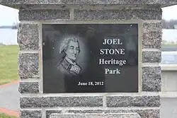 At the waterfront in the Town of Gananoque is a heritage park dedicated to Stone, named the Joel Stone Park. It has 3 cannon and a memorial commemorating the War of 1812. There is also a bronze diorama representing the town as it was in 1812, an amphitheater and the beginning of a heritage trail.[5]
