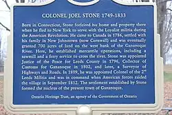 - ^ "Colonel Joel Stone Historical Plaque". Ontario Plaques. Retrieved 10 November 2015.