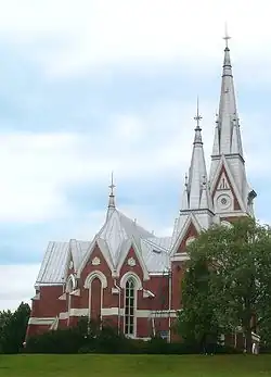 Joensuu Church is located in the centre of Joensuu, North Karelia, Finland. The church was built in 1903 and designed by a Finnish church architect Josef Stenbäck.[1][2][3] Architecturally it represents the Gothic Revival style, but it also has some features of National Romantic style. The high tower located in the northeast corner is the bell tower and in the lower southwest tower is the organ, which was built in 1969 by Organ Factory of Kangasala and has 36 stops. The church has 1000 seats. The altar painting is called The Crucifixion of Jesus and it is painted by Ilmari Launis in 1910.[1][3]