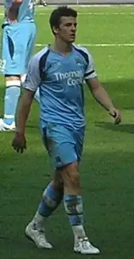 Barton would have made his debut for the City first team in November 2002 against Middlesbrough, had he not lost his shirt after leaving it on the substitutes bench at half-time.[21] He eventually made his first-team debut for the club against Bolton Wanderers on 5 April 2003.[22] His first senior goal came two weeks later in a 2–0 win over Tottenham Hotspur on Good Friday.[23] He ended the 2002–03 season with a run of seven consecutive starts.