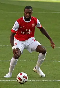 After Touré's departure to Manchester City, Djourou had a chance to break into the starting eleven.[59] However, he suffered a knee injury while on international duty.[60] It was announced on 6 September 2009 that Djourou's recovery period would take an estimated of six to eight months; Arsène Wenger stated: "He will have to be patient this season."[61] After returning to training in April, Djourou made his return from injury, coming on as a second-half substitute the injured Mikaël Silvestre, in the 4–0 win over Fulham in Arsenal's final game of the season, in what turned out to be his only appearance in the 2009–10 campaign.[62]
