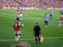 His first appearance of the 2005–06 season came on 29 November 2005 against Reading in the Round of 16 of the League Cup, starting the whole game, in a 3–0 win.[19] He then played in the third round clash with Cardiff City.[20] Djourou made his full Premiership debut for Arsenal in the 7–0 victory over Middlesbrough on 14 January 2006, playing at centre-back with Philippe Senderos.[21] He started Arsenal's FA Cup fourth round clash with Bolton Wanderers as part of a makeshift defence, a game in which Arsenal lost 1–0.[22] In February 2006, Djourou played in the league games against West Ham United, Birmingham City and Bolton Wanderers.[23] After a five match absence, he returned to the first team, coming on as a substitute against Aston Villa in Arsenal's 5–0 victory, replacing the injured Emmanuel Eboué.[24] Djourou then started in a league match against Portsmouth on 12 April 2006, a game which also saw the comeback of Sol Campbell, in a 1–1 draw.[25] At the end of the 2005–06 season, he went on to make twelve appearances in all competitions.