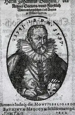 Bauhin studied botany at the University of Tübingen under Leonhart Fuchs (1501–1566). He then travelled with Conrad Gessner, after which he started a practice of medicine at Basel, where he was elected Professor of Rhetoric in 1566. Four years later he was invited to become the physician to Frederick I, Duke of Württemberg at Montbéliard, in the Franche-Comté where he remained until his death. He devoted himself chiefly to botany. His great work, Historia plantarum universalis, a compilation of all that was then known about botany, remained incomplete at his death, but was published at Yverdon in 1650–1651.[1]