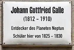 Galle was born in the Papsthaus (a house in the Pabst wood) 2 km west of Radis in the vicinity of the town of Gräfenhainichen, as the first son of Marie Henriette née Pannier (1790–1839) and Johann Gottfried Galle (1790–1853),[2] an operator of a tar oven. He attended the Gymnasium in Wittenberg and studied at Friedrich-Wilhelms-Universität Berlin from 1830 to 1833. He became a teacher at the Gymnasium in Guben, teaching mathematics and physics. Later on, he transferred to the Gymnasium in Berlin.