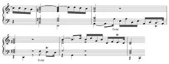 Anmuthige Clavier-Übung (Nuremberg, 1698) was the second collection of keyboard music Krieger published, and it is a much more important work. It comprises 25 pieces: nine preludes, five ricercares, seven fugues, two toccatas, a fantasy, and a chaconne. Ricercares and fugues showcase Krieger's contrapuntal skills which his contemporaries praised. For example, five of the fugues form a sequence in which four subjects are first treated independently (fugues nos. 11–14), and then appear together in a quadruple fugue (fugue no. 15). Almost all of the ricercars employ inversion, either as an inversion fugue, from the very beginning (nos. 2, 8, and 17), or in a separate section (nos. 3 and 7); ricercar no. 7 has a countersubject that is inverted in the course of the piece.[3] Non-imitative pieces in the collection also have a fair share of interesting characteristics. The Chaconne in G minor marks the earliest known instance of an eight-bar ostinato pattern, as opposed to the more traditional four-bar pattern. It contains 29 variations, some of which form pairs, and the first setting of the theme returns and is used as a refrain three times. Toccata mit dem Pedal aus C, the last piece in Anmuthige Clavier-Übung, was described by Willi Apel as "perhaps the only fully-developed toccata written in central Germany before Bach." The toccata starts with a pedal solo, which is followed by a chordal section with recitative breaks, a song-like section in 3/4 time, an interlude, and a fugue whose subject is heard in the pedal twice, requiring alternating feet. Sectional organ works with virtuosic use of pedal were common for north German composers, but no central or south German composers attempted such pieces before Krieger. North German influence is also apparent in the other toccata of the collection, Toccata in D minor.[4] Krieger's preludes are short pieces, free developments of a harmonic or a rhythmic idea,[1] employing fast passagework, short fugatos, etc.[5]