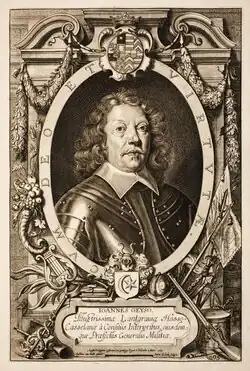 Following the ascension of Countess Amalie Elisabeth to the throne in September 1637, Geyso gains a more prominent role in the Langravate's military campaigns against the rival Landgraviate of Hesse-Darmstadt. In the autumn of 1641, he commanded the defense of Dorsten finally handing it over to Imperial troops on favorable conditions. In 1644, he was summoned by Swedish field marshal Lennart Torstensson who requested his assistance with the encircling of Imperialist Matthias Gallas' army which at the time operated in the vicinity of Magdeburg.[2] Geyso's 2,300 men took part in grueling march through flooded areas, arriving in time to witness the disintegration of the Imperialist army. On 3 August 1645, the courage of the Hessians contributed to the victory at the Battle of Nördlingen (1645).[3]
