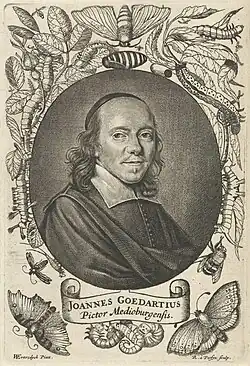 Goedaert was born in Middelburg where he was baptized on 19 March 1617. His mother was Judith Pottier and his father Pieter Goedaert died when he was eight years old. At the age of 18 he became a member of the Saint Lucas Guild for painters. Hardly anything is known about Goedaert’s training in draughtsmanship and painting. He was a contemporary of such painters as Adriaen van de Venne, Francois Ryckhals, Mattheus Molanus and Christoffel van den Berghe, who were active in Middelburg in the first half of the 17th century. As van den Berghe included paintings of insects in his work, it has been suggested that he might have been Goedaert’s teacher. However, this is not certain. Goedaert published, in his birthplace, a book entitled Metamorphosis Naturalis between 1660 and 1669, which was translated into French in 1668-1669 as Histoire Naturelle des Insectes, in Latin "Metamorphosis et Historia Naturalis Insectorum" and by Martin Lister in 1682 into English as Johannes Godartius of Insects with plates by Francis Place.[1] The book shows meticulous observations of the growth phases of insects, including metamorphosis. The life histories of parasites was not fully understood by Goedaert and he thought that caterpillars could either produce adult flies or butterflies.[2] Throughout his life he collected, raised and studied insect larvae and maggots. He not only described the process of their development but also painted and drew the various stages the insects passed through during their life cycle. He was also the first person to give Dutch names to many types of insects found in and around Middelburg. Goedaert was a natural theologian and believed that his studies revealed the genius of the Creator. He also believed that there was a limit to exploration and did not make use of a microscope. He believed that the attraction of insects to candles was a warning to those who were excessively curious.[3] He stimulated interest in insects and generated further research in this field through the text and the detailed illustrations in his books. Goedaert also questioned ideas of his time that mosquitoes were spontaneously created from dew. He illustrated and noted that their larvae emerged from eggs. Some landscape and still-life paintings made by Goedaert have also survived.[4][5]