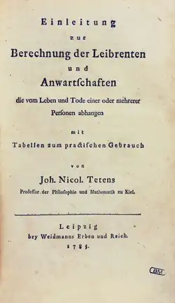 The book Einleitung zur Berechnung der Leibrenten und Anwartschaften, published in Leipzig in 1785 (first part) and 1786 (second part) was a landmark of actuarial science. It contains an extensive synthesis of previous work on the subject, from Halley's mortality table to Richard Price's Observations on reversionary payments. It is recognized by actuaries for featuring the first risk measure ever (the Risico der Casse);[6] moreover it offers some insights in mathematical statistics: by using an approximation of the binomial distribution, Tetens tried to compute the confidence level of a given sampling procedure.[7]