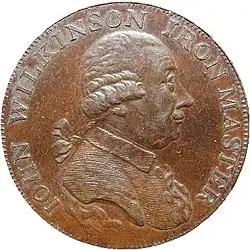 After working with his father in his foundry, from 1755 John Wilkinson became a partner in the Bersham concern and in 1757 with partners, he erected a blast furnace at Willey, near Broseley in Shropshire.[5] Later he built another furnace and works at New Willey. He made his home in Broseley in a house called 'The Lawns' which became his headquarters for many years. He had houses either side of 'The Lawns' which served for administration, one being named 'The Mint' used for distribution of the thousands of tokens, each valued equivalent to a halfpenny. In east Shropshire he also developed iron works at Snedshill, Hollinswood, Hadley and Hampton Loade. He and Edward Blakeway also leased land to build another works at Bradley in Bilston parish, near Wolverhampton.[6] He became known as the 'Father' of the extensive South Staffordshire iron industry with Bilston as the start of the Black Country. In 1761, he took over Bersham Ironworks as well. Bradley became his largest and most successful enterprise, and was the site of extensive experiments in getting raw coal to substitute for coke in the production of cast iron. At its peak, it included a number of blast furnaces, a brick works, potteries, glass works, and rolling mills. The Birmingham Canal was subsequently built near the Bradley works.