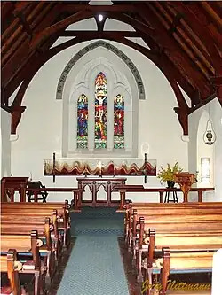 Acland was active in the Anglican Church, a member of the synod for many years and licensed as a lay reader.[1][22] In 1866, he donated land for a church where four children who died in infancy were buried, including two of the Acland children. Emily Acland laid the foundation stone in December 1868 and the first service was held in the church on 30 May 1869 by his father in law.[22] The church, which has capacity for 80 people, was consecrated on 12 December 1869.[1][22] Its name, the Church of the Holy Innocents, was chosen in reflection of the four infants buried in the location.[22] The stained glass window in the wall behind the altar was destroyed in the 2010 Canterbury earthquake, only months before the church was due to be earthquake strengthened.[23] John and Rosemary Acland, descendants of JBA Acland who still live at Mount Peel, pulled every splinter of stained glass out of the rubble that they could find. This will allow a stained-glass artist, Graham Stewart, to restore the window.[24]