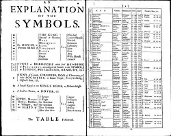 Aware that he had needed to omit a great many places shown on Saxton's and Norden's county maps, Adams began to compile a list of them, and engaged King to supplement this list by extracting place-names from the recently collected records of the Hearth Tax surveyors.[11] The resulting Index Villaris, or an Alphabetical Table of all Cities, Market-towns, Parishes, Villages, Private Seats in England and Wales, published in 1680, contains no fewer than 24,000 entries detailing key information about each place; the publication included a copy of the reduced 1679 map. In the Preface, Adams described how, before coming to London, he had tabulated the distances between market towns in north Wales in order to calculate the potential market for fish landed at Aberdovey; on his arrival in London and recognising the economic value of such distance tables he had extended them across the whole of England and Wales. The inclusion of geographical coordinates for every place, calculated by triangulating the distances between places reported by his correspondents and between points indicated on earlier maps (taking as a basis the coordinates of county towns published by Speed),[12] is testament to Adams' vision and tenacity.[note 5] Index Villaris was so successful that it was reprinted in 1690 and again in 1700,[note 6] and numerous copies remain in the local collections of the National Trust.[14]