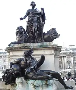 George III with the River Thames | Somerset House, London | 1779 | Sculpture groups on pedestal | Bronze and stone | Grade I | Q17527239 | [18][19][20]
