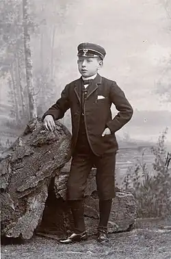 John Bauer was born on 4 June 1882 in Jönköping, the son of Josef Bauer, a man of Bavarian origin, and Emma Charlotta Wadell, from a farming family from the town Rogberga just outside Jönköping.[1][2] Josef Bauer came to Sweden in 1863, penniless. He founded a successful charcuterie business at the Östra Torget in Jönköping.[2] The family lived in the apartment above the shop until 1881 when the construction of their house in Sjövik was completed.[3] John, born in 1882, lived at the Villa Sjövik by the shore of Lake Rocksjön with his parents and two brothers, one older and one younger; his only sister died at a young age.[2] The family home would remain central to him long after he lived on his own.[3][4] His initial schooling was at the Jönköpings Högre Allmäna Läroverk (The Jönköping Public School of Higher Education),[1] followed by the Jönköpings Tekniska Skola (The Jönköping Technical School)[5] from 1892 to 1898.[1] He spent most of his time drawing caricatures of his teachers and daydreaming, something not appreciated by his teachers.[4][2]