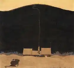 Although reluctant to audition for the commission, on 15 July 1904 Bauer left for Lappland and stayed there for a month. Coming from the dense, dark forests of Småland he was overwhelmed by the open vistas and colorful landscapes. His encounters with the Sami people and their culture became important for his later works. He took many photos, sketched and made notes of the tools, costumes and objects he saw, but he had difficulty becoming close to the Sami, due to their shyness.[16] He recorded his experiences in his diary and in letters to his family and friends.[17] After a visit to a Sami goahti he noted: "All light from above. If the head is tilted forward it is dark. The lit parts of the figure always lighter than the tent canvas. Sharp shadows run like spokes from the middle of the goathi."[18]