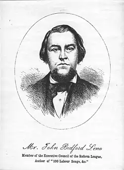 John Bedford Leno (29 June 1826 – 31 October 1894) was a Chartist, radical, poet, and printer who acted as a "bridge" between Chartism and early Labour movements, as well as between the working and ruling classes. He campaigned to give the vote to all common men and women, driven by a strong desire for "justice and freedom for all mankind". He was a leading figure in the Reform League, which campaigned for the Reform Act 1867. He was called the "Burns of Labour" and "the poet of the poor" for his political songs and poems, which were sold widely in penny publications, and recited and sung by workers in Britain, Europe and America. He was an entertaining and persuasive orator and his speeches were in great demand around London. He owned, edited and contributed to Radical and Liberal newspapers and journals, and printed and distributed bills advertising London Reform meetings and demonstrations. He wrote the international hit 'The Song of the Spade'.[1]
