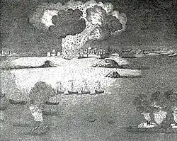 Benbow returned to active naval service in September 1693, joining Thomas Phillips, the second engineer of the ordnance, in jointly commanding a flotilla of bomb vessels to attack Saint-Malo.[1] Benbow went aboard the 48-gun HMS Norwich and began the bombardment on 26 November.[25] It continued intermittently until 19 November when a large fireship was sent into the harbour. An attempt was made to bring her alongside the town walls, but she ran aground, was set on fire, and exploded. Despite the failure of the initial plan, considerable damage was done, and Benbow's forces were able to take the fort on Quince Rock and disable it, carrying artillery and prisoners away and bringing them to Guernsey.[19] Benbow was still dissatisfied with the overall result and initiated a court-martial against Captain Henry Tourville, accusing him of cowardice for not bringing his ship in closer. There was no conviction though, as the mortars were proved to be defective.[14]