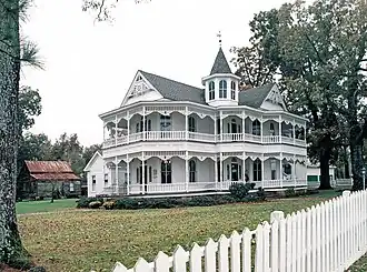 A unique example of Steamboat Gothic architecture, the John Blue House provides a glimpse into the past of the rural Carolinas. The home features 12 exterior doors, each with its own stained glass light above. The house has nine fireplaces and rare double circular porches.[2]