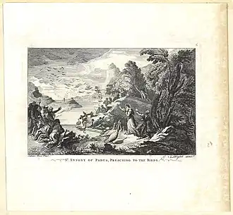 In 1751, with his large volume of prints, Boydell moved to larger premises at 90 Cheapside.[3] By 1755, he had published A Collection of One Hundred and Two Views, &C. in England and Wales. This cheap but successful book gave him capital to invest.[14] He became increasingly immersed in the commercial side of the print business and like most print dealers began importing prints to sell. These included print reproductions of landscapes by artists such as Claude Lorrain and Salvator Rosa.[3] The bulk of the imports came from the undisputed masters of engraving during the 18th century: the French. Boydell made a small fortune in the 1750s from these imported prints.[15] His early success was acknowledged in 1760 when he was accepted as a member of the Society of Arts.[16][17] Winifred Friedman, who has written extensively on Boydell, explains that despite this success, "[w]hat rankled Boydell was that the French would not extend credit, or exchange prints; he was required to produce hard cash. Boydell took action, and this was the turning point."[2][18]