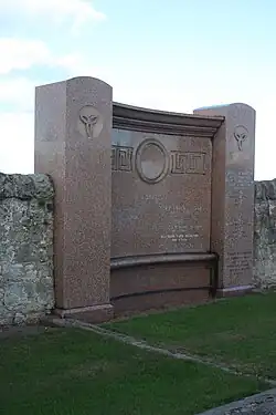John Brunton died in 1937. He is buried in Inveresk cemetery with his wife, who died in 1899. His name is written on the reverse of the large red granite monument and is only visible from the northern cemetery. The monument includes a stone bench on its south side.