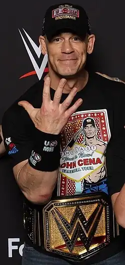 John Felix Anthony Cena (/ˈsnə/ SEE-nə; born April 23, 1977) is an American actor and professional wrestler. Signed to WWE since 2001, he is a record 17-time world champion, holding the most recognized world title reigns in the promotion's history.[8] He is widely regarded as one of the greatest professional wrestlers of all time.[9][10][11][12] Cena has also starred in numerous films and TV shows, including The Marine, Bumblebee, and F9, as well as currently starring in the TV series Peacemaker (2022–present) as the eponymous lead.