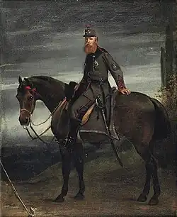Charlton occasionally turned to wars from earlier periods or foreign wars not involving Britain, such as After the battle: Sedan, based on an incident in the Franco-Prussian War of 1870 described by Émile François Zola in La Debâcle. In this piece, Charlton chose one of his favourite themes, that of riderless horses after a battle, in this case in a mad gallop "across the blank, silent country." Scenes from the Peninsular War and the English Civil War followed, while his painting of Prussian General Seidlitz at the Battle of Rossbach in 1757 was shown at the Berlin Art Gallery in April 1914. It attracted the attention of a wealthy German who offered to buy the piece, but before the sale could be finalised, war broke out and the picture was 'interned' in Germany.