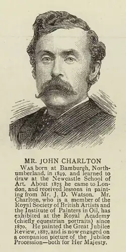 Born to Samuel Charlton and his wife Mary Ann (née Pickering) Charlton on 28 June 1849, in Bamburgh, Northumberland, he received his first lessons in drawing from his father when he was only three or four years old, and within a few years was drawing horses with some skill. Due to his family's financial misfortunes, he had to attend Dr. Sharp's charity school held in Bamburgh's great castle, and a few years later, was forced to quit and find employment. A job in the Newcastle bookshop of Mr. Robinson, a keen collector of the work of Thomas Bewick, "the father of wood engraving,” gave him an appreciation of graphic art. It was here that the budding artist began to imitate the master's work, much to the delight of two of Bewick's ageing sisters. Later he spent seven monotonous years employed in the office of Sir Isaac Bell's ironworks, but seeing the young man's skill at draughtsmanship, his employers regularly granted him one day a week in which to practice his art. Mr. Joseph Crawhill suggested that he attend evening classes at the Newcastle School of Arts under William Bell Scott. During this time he began to develop quite a reputation on Tyneside as a painter of horses and dogs, and he received some commissions to portray family pets.