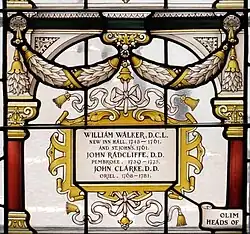 ![]() Stained glass by C. E. Kempe in the Grundy Library, Abingdon School, containing the name of John Clarke | |