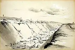 Late 1840s Bourne started working for Charles Blacker Vignoles, who was employed to construct the Nicholas Chain Bridge in Kyiv over the Dnieper River.[28] Bourne made the following sketch, which was presented to the Tsar in 1847.[29] The construction of the bridge started in 1848 and was completed in 1855. Bourne made drawings and later weekly photographs of every stage of its construction.