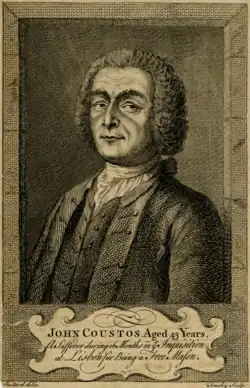 John Coustos (1703 in Bern – 1746) was an 18th-century Swiss businessman living in England.[1] Coustos is primarily known for his involvement with Freemasonry after joining the Premier Grand Lodge of England in London (where he was allegedly a spy for British Whig Prime Minister, Robert Walpole). He subsequently was active in Freemasonry in Lisbon and came into conflict with the Portuguese Inquisition. The fallout in the aftermath of this was a major event in the struggle between Catholicism and Freemasonry.