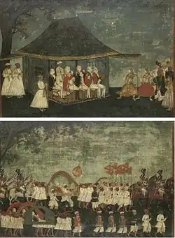 The Dalling Cabinets, sold at Christie's in London in 2005 for £78,000[11] a pair of Anglo-Indian Vizagapatam ivory bureau cabinets, made circa 1786, on ebonised and parcel gilt stands, c1810,[12] were made for Dalling near Madras and brought home to Britain. Each is inlaid overall with panels depicting buildings, trees and flowers, surrounded by borders of scrolling foliage, with triangular open pediment above a frieze drawer and three pigeon-holes and three drawers flanked by doors enclosing two pigeon-holes and three drawers, above a hinged flap enclosing a fitted interior of pigeon-holes and drawers divided by column-drawers, above a long drawer fitted with divisions, on bracket feet, the interior and carcase in satinwood, on a rounded rectangular stand with solid three-quarter gallery above a reeded frieze, on spirally-fluted tapering legs and ring-turned tapering feet, minor variations in size and decoration, the pediment now positioned at the rear edge. These engraved bureau-cabinets, serving as portable desk jewel-case and dressing-box, are designed as a miniature 'desk and bookcase' with Roman-temple pediment. Engraved tablets, wreathed by floral 'chintz' fashioned borders, portray magnificent villa landscapes. This artistic India-flowered furniture, crafted in ivory veneer, was retailed in Madras and Calcutta by the English and Dutch East India Companies; but it was primarily manufactured in Vizagapatam, on the northern Coromandel Coast. Two other related cabinets,[13] from the estate of Alexander Wynch, a former East India Company Governor of Fort St. George, were acquired in the 1770s by George III.[14][15] They measure: (overall) 57¼ inches high; 26½ inches wide; and 13½ inches deep. The cabinets are 36¾ inches high; 25 inches wide; and 11¾ inches deep. The English stands are 20½ inches high.