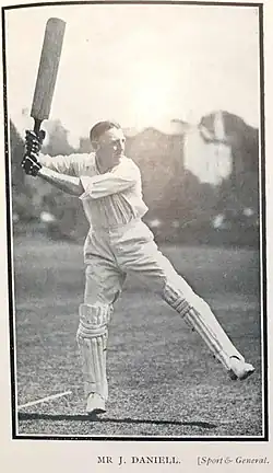 As a player, Daniell was a pugnacious batsman of no exceptional talent, batting mostly in the middle order but occasionally promoting himself to open the innings. In almost 30 years of first-class cricket, he scored only nine centuries, and two of those were in one match in 1925. He never achieved 1,000 runs in a first-class season, and his career average was 21 runs an innings. He was noted as a fearless fielder, usually in positions in front of and close to the wicket. In his early career and at school, he had bowled fast, but in the 20 years from 1908 until he retired in 1927 he bowled only 10 overs in total in first-class cricket: that he took three wickets in them suggests he might have been better than he considered himself.